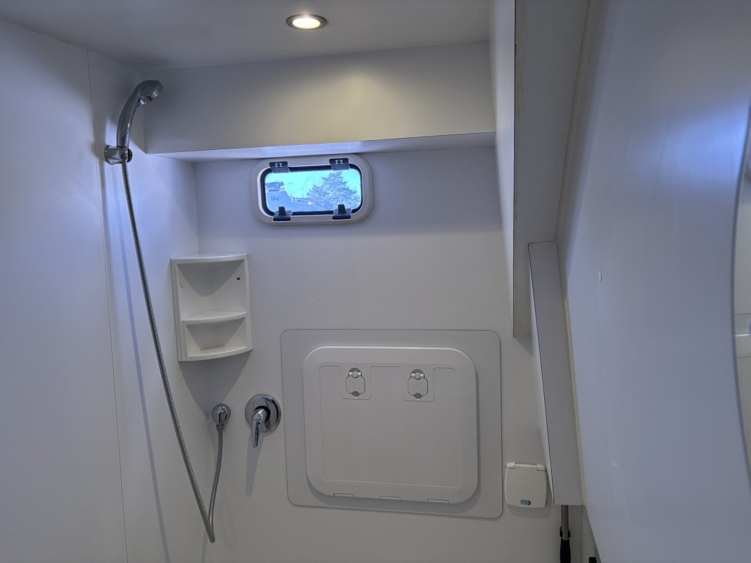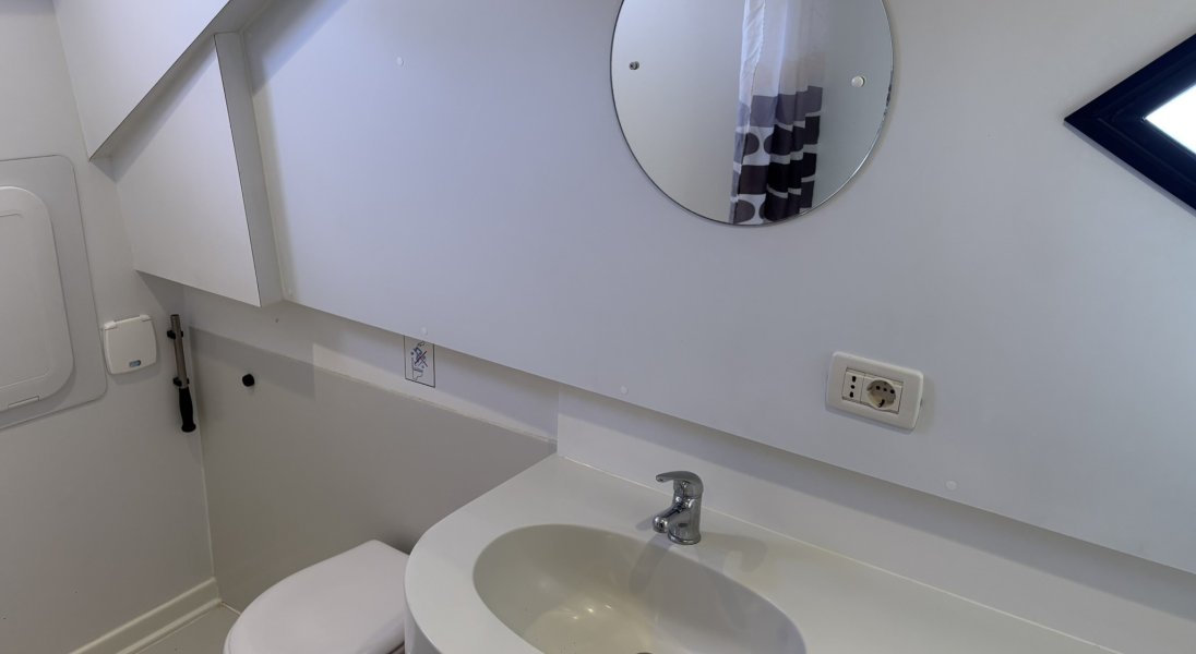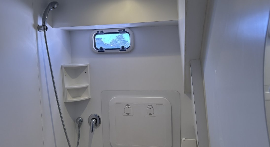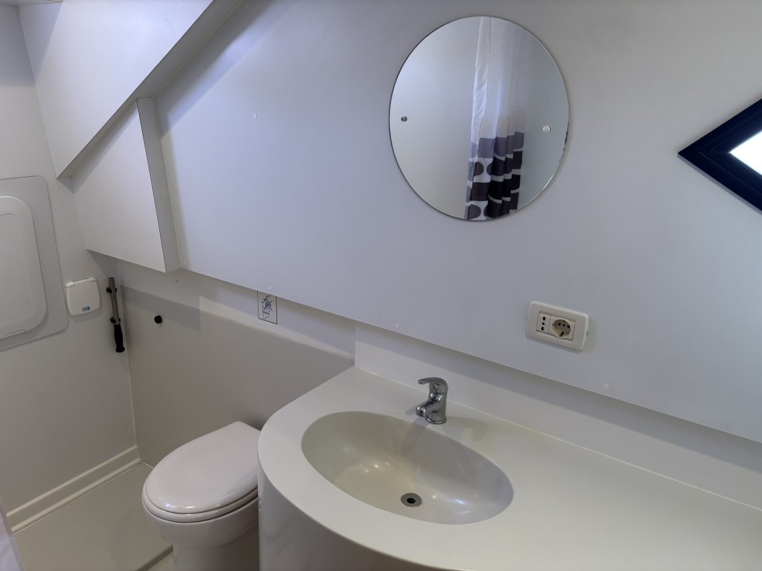 1 locale bagno sdoppiato a prua con bagno e lavabo da un lato e locale esclusivo doccia dall’altro