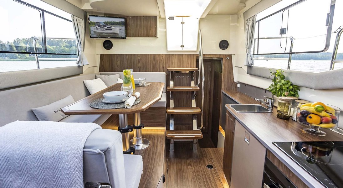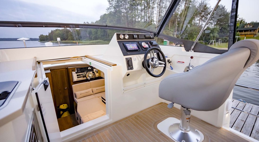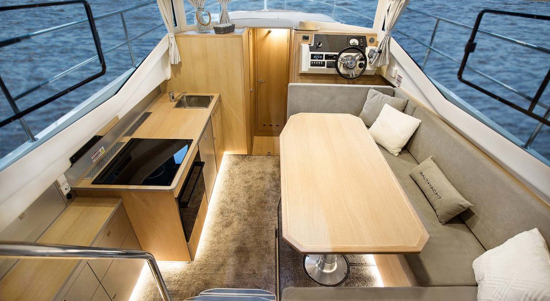 Ampio pozzetto con parabrezza in plexiglass, tergicristallo, console, postazione di guida principale e modulo cucina in laminato con piano di lavoro in Corian