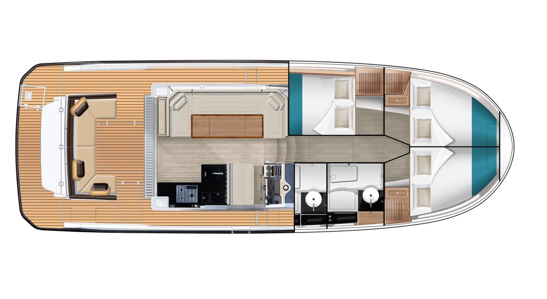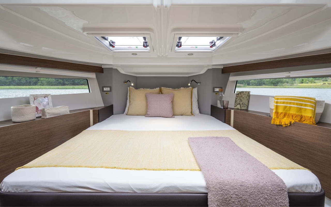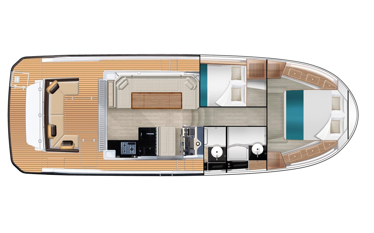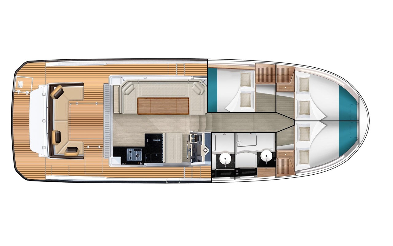 La scelta più apprezzata e diffusa, capace di ospitare fino a tre cabine matrimoniali e due bagni. Soluzioni ricercate e di alta qualità impreziosiscono tutte le aree di bordo, dagli interni della dinette agli spazi del pozzetto.