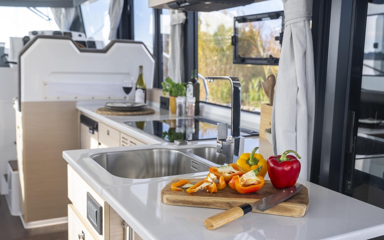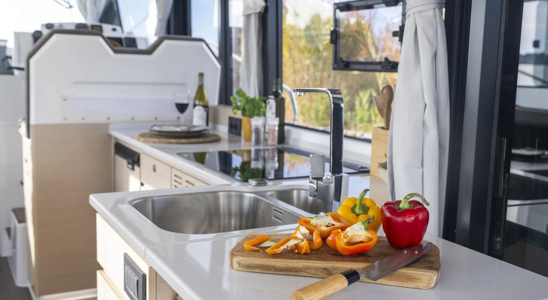 Modulo cucina a L completo di Lavabo, scompartimenti con finecorsa ammortizzato, armadietti e scomparti di stivaggio, piano cottura 3 fuochi, frigorigero di grande dimensione con apertura frontale, pensili, cestino, 2 prese da 230V