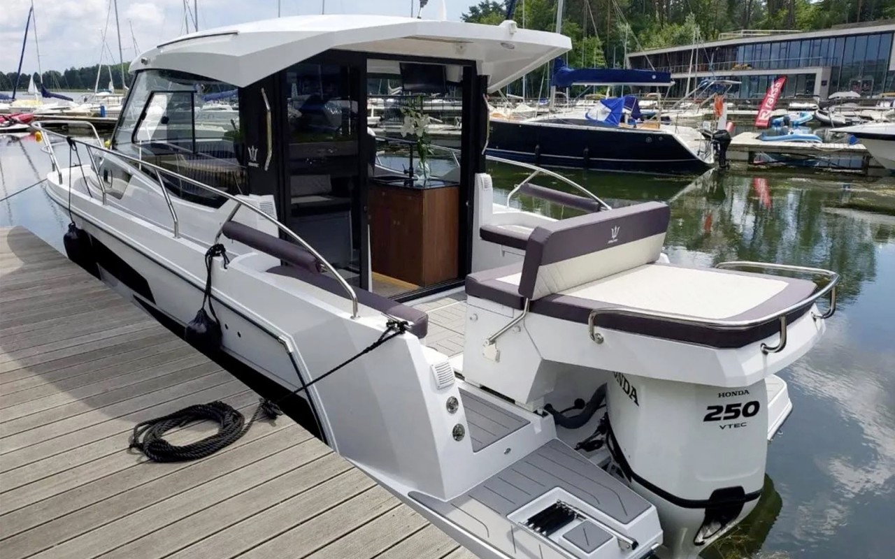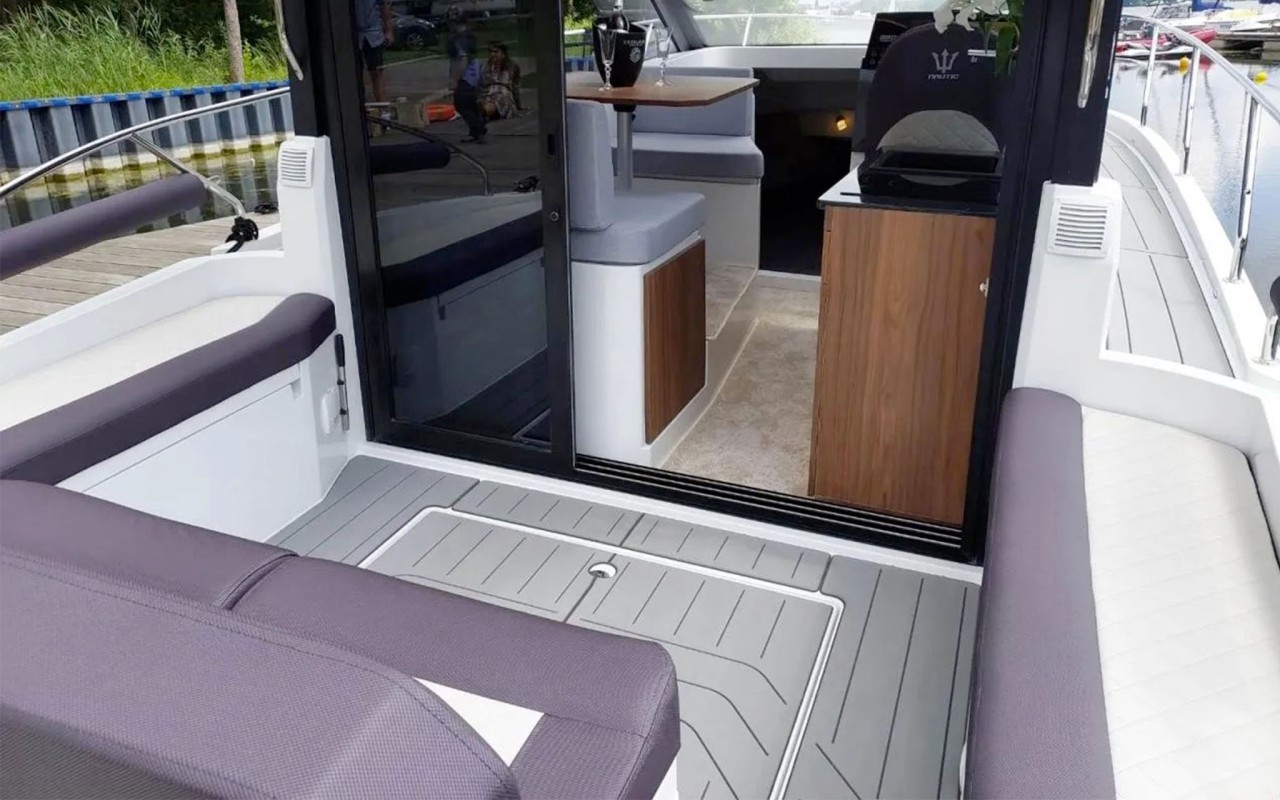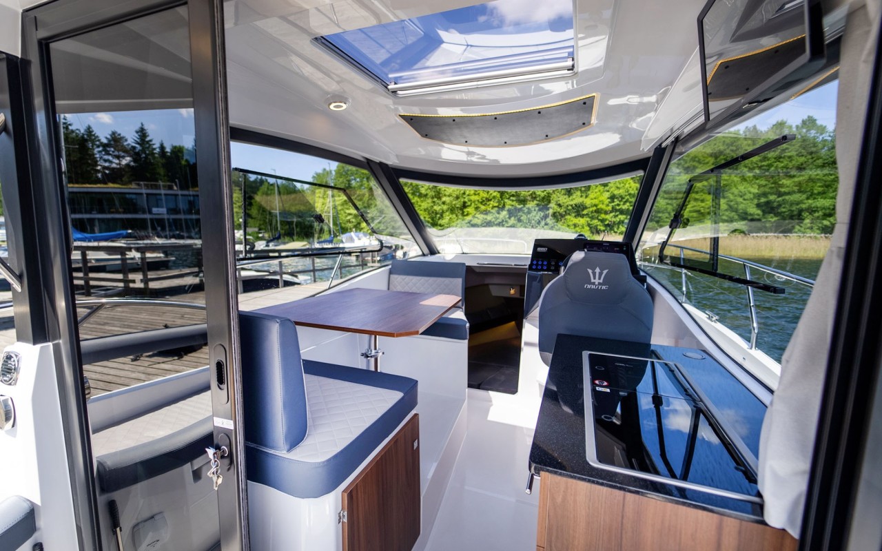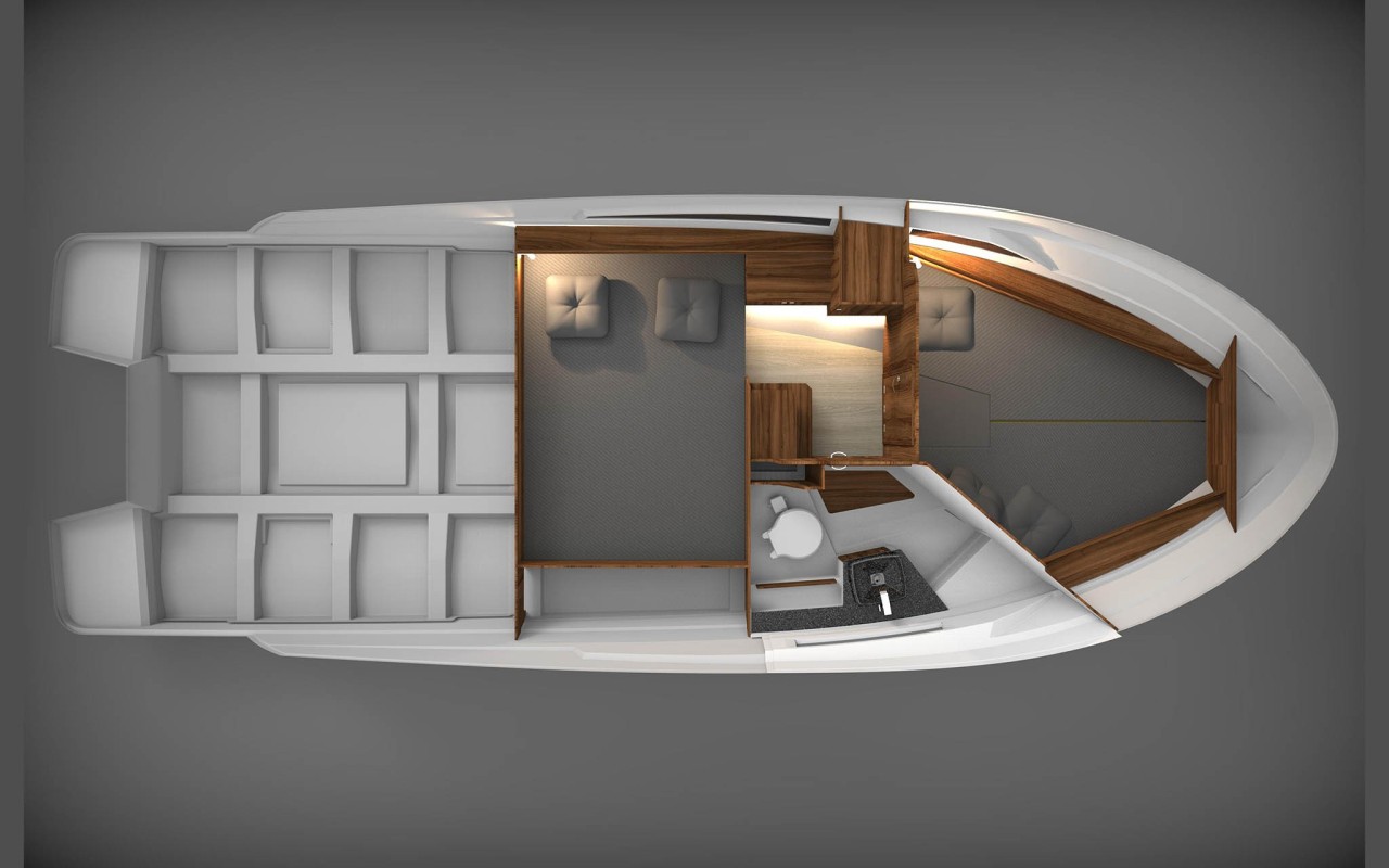Nonostante le dimensioni contenute, l'imbarcazione accoglie due cabine, una dinette convertibile, una cucina e un bagno a tutta altezza. L'organizzazione degli spazi esterni prevede un pozzetto con sedute e tavolo, un'area prendisole a poppa e una seconda, particolarmente ampia, a prua. Una distribuzione degli ambienti sorprendente per questa categoria.
